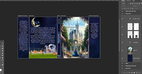First, I made a mood board to collect ideas and inspiration for my book cover. Next, I went to Google Classroom to download the book cover template. I opened up Adobe Photoshop and placed my template. Then, I looked up a font for my tile and an image I could use for my cover. During the bell ringer, we wrote information about the publisher and a description about the book. I put the publisher's information inside of the back flap and the description on the back cover. Also, I looked up a quote from Cinderella and added the quote on the front flap. Finally, I added all my images and tried to make them all blend together to see if they all looked good together. Also, I saved it as a copy, Photoshop PDF, and turned it into my best work. For my cover mockup, I went to Google Classroom, downloaded the mockup, and added it to Adobe Photoshop. Then, I went back to my book cover and exported it, I only selected the front and back cover and saved it. I went back to my mockup placed my front cover on book 1 and placed the back to book 2.